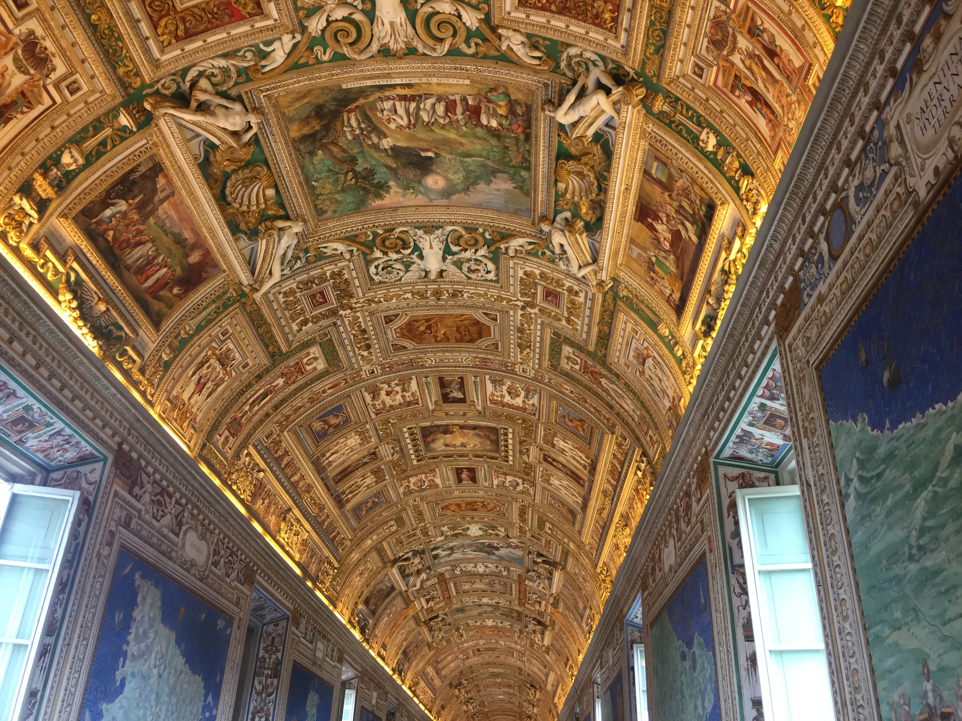 한쪽 벽면을 따라 16세기 이탈리아 지도가 쭉 펼쳐진 회랑. 하지만 천장이 더 눈길을 끌어요—정말 황금빛과 그림이 어우러져 장관이었습니다. 사진 찍기 좋은 장소이기도 하죠!